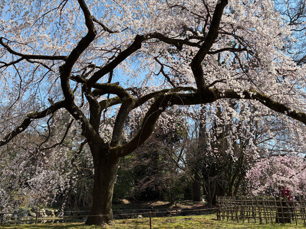 早咲きの近衛の糸桜(京都三ツ星桜)は、孝明天皇が「昔より名にはきけども今日みればむべめかれせぬ糸さくらかな」と詠まれています。