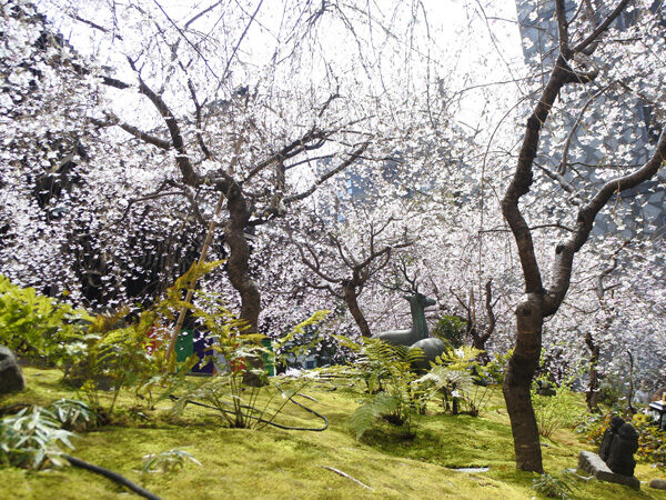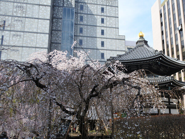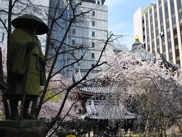 六角堂(ろっかくどう)は、都会のビルに囲まれた無料の桜スポットです。境内には早咲きから遅咲きまで約30本の桜が植えられており、「十六羅漢像」「へそ石」「わらべ地蔵」と桜の共演も見どころです。